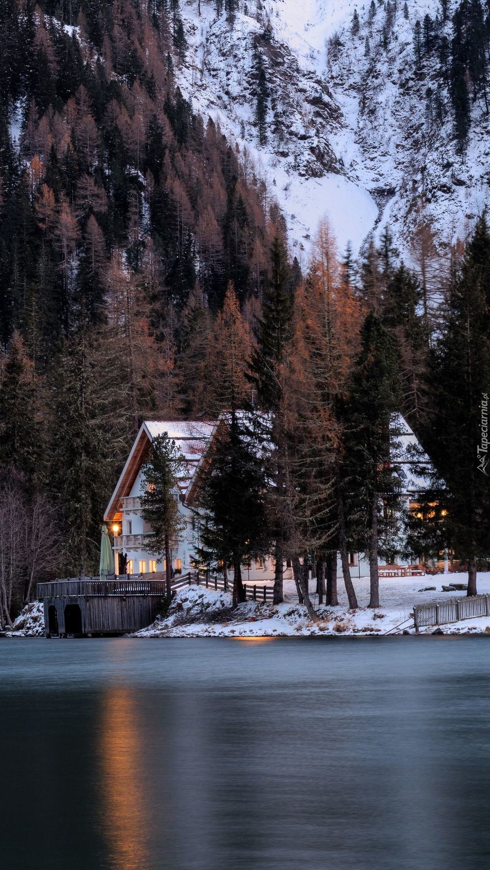 Edytor tapety: Hotel nad jeziorem w zimowej scenerii