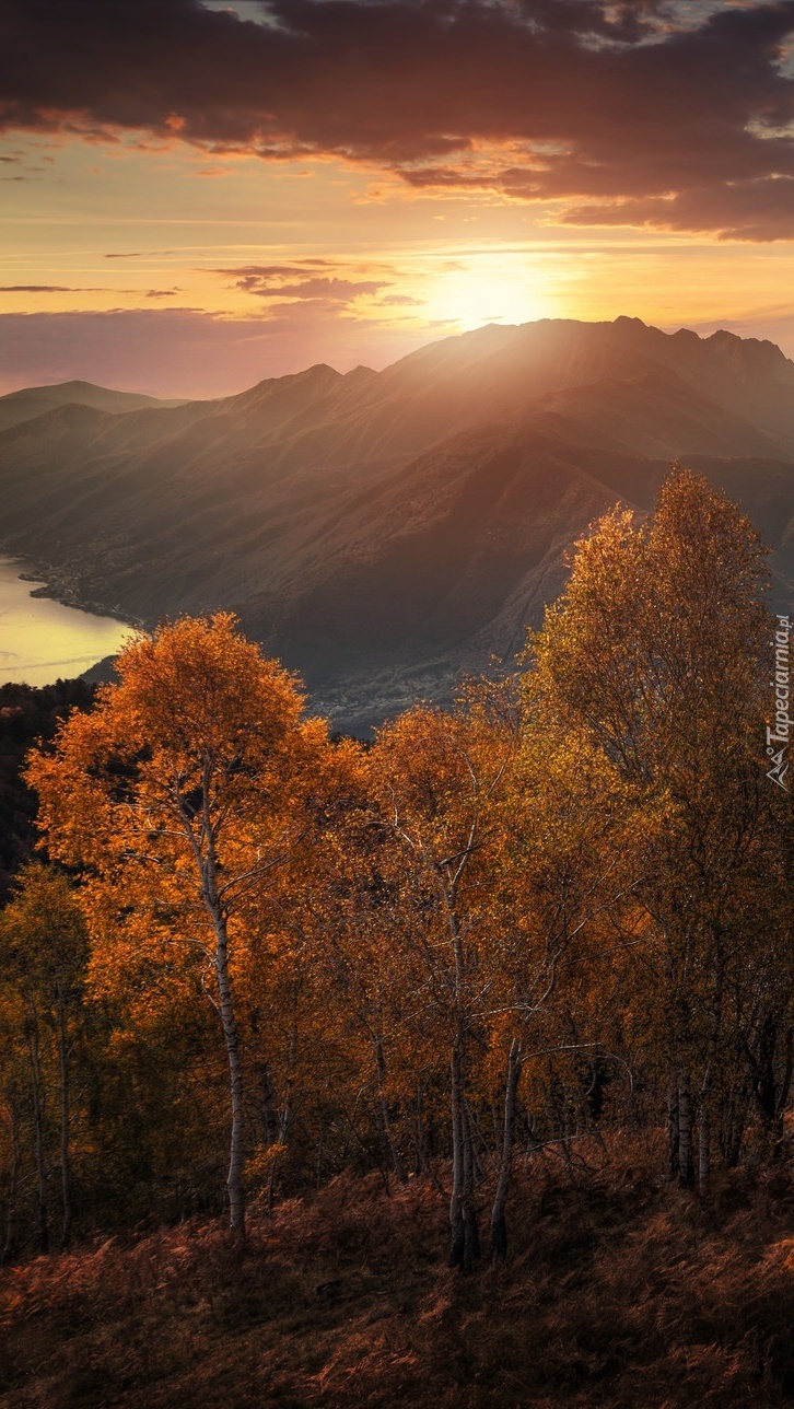 Edytor tapety: Słoneczny blask nad górami i lasem