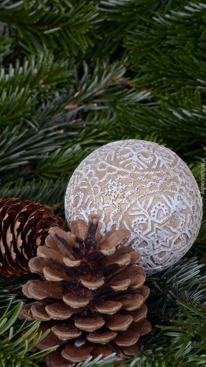 Edytor tapety: Bombka na zielonych gałązkach z szyszkami