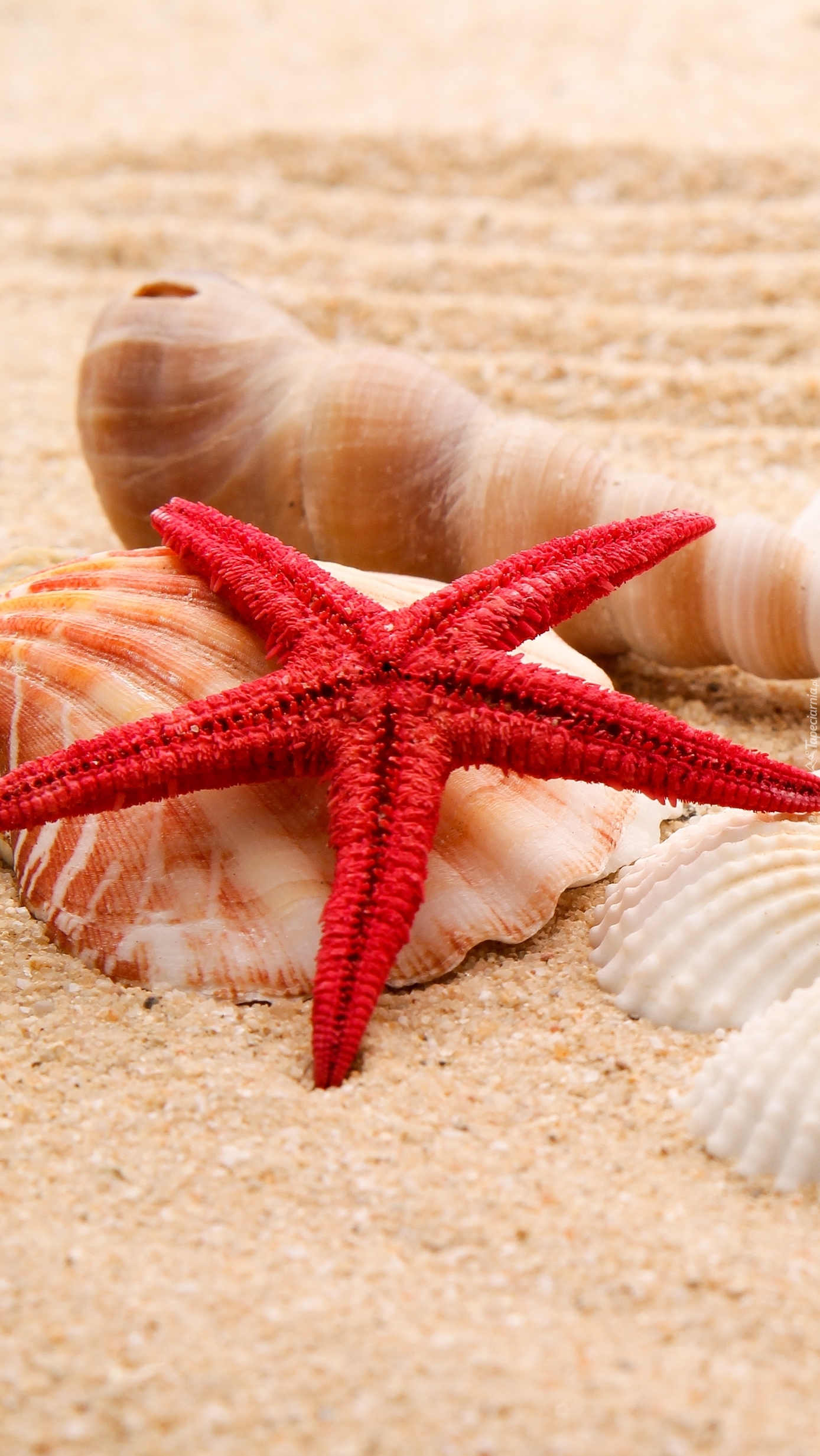 Edytor tapety: Czerwona rozgwiazda i muszelki na piasku
