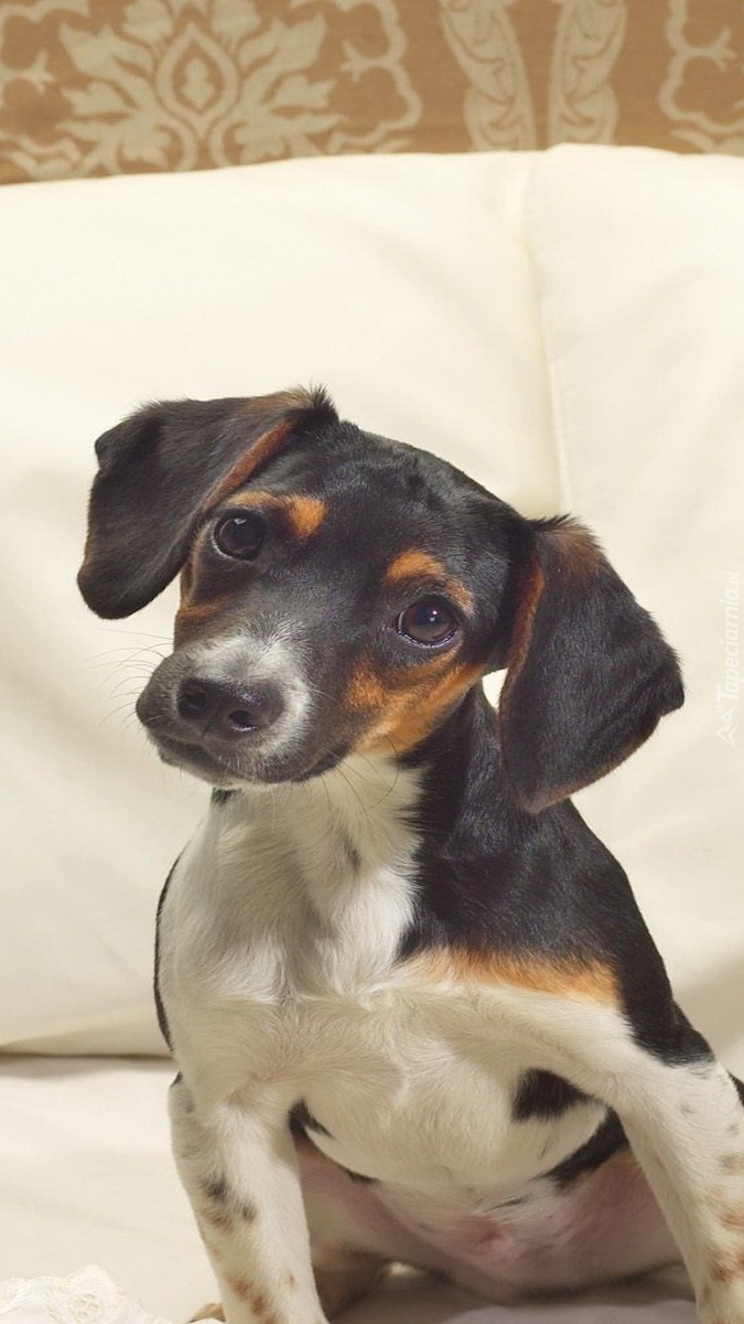 Edytor tapety: Zaciekawiony piesek siedzi i patrzy