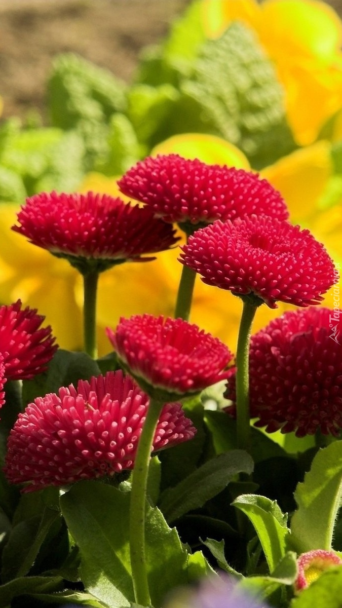 Edytor tapety: Czerwone stokrotki z listkami