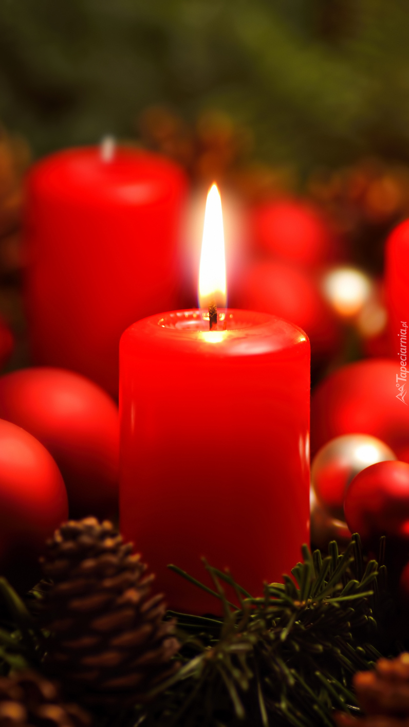 Edytor tapety: Adwentowa świeca na świerku z bombkami