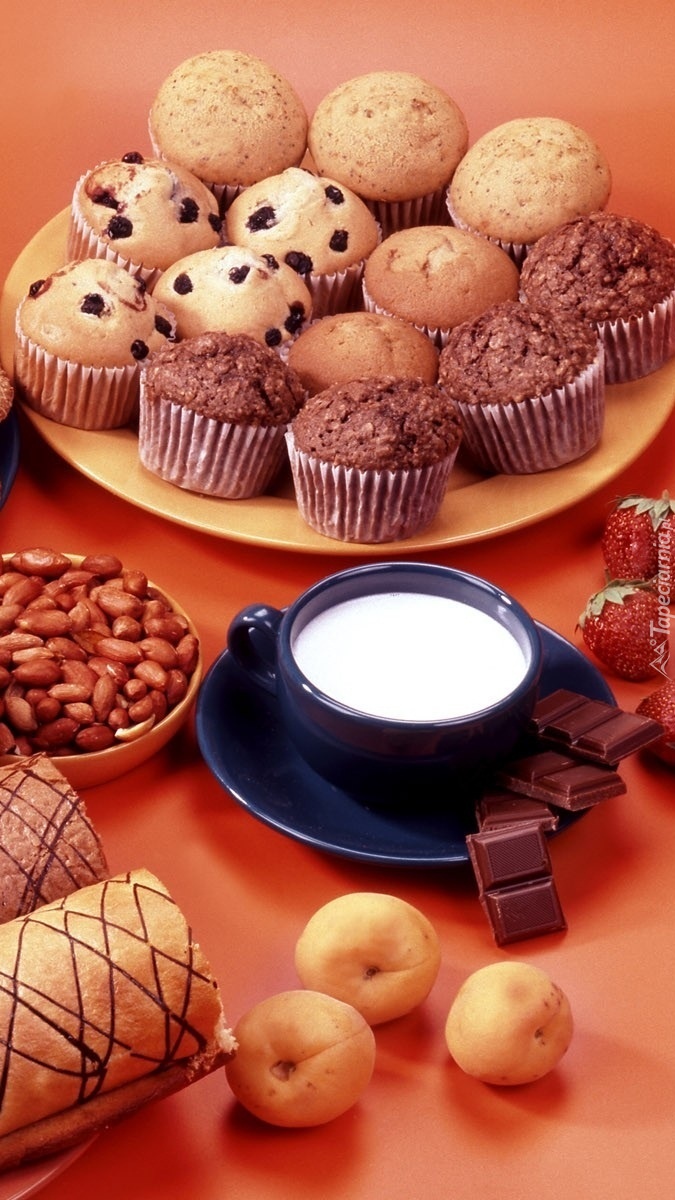Edytor tapety: Filiżanka mleka obok talerza z babeczkami