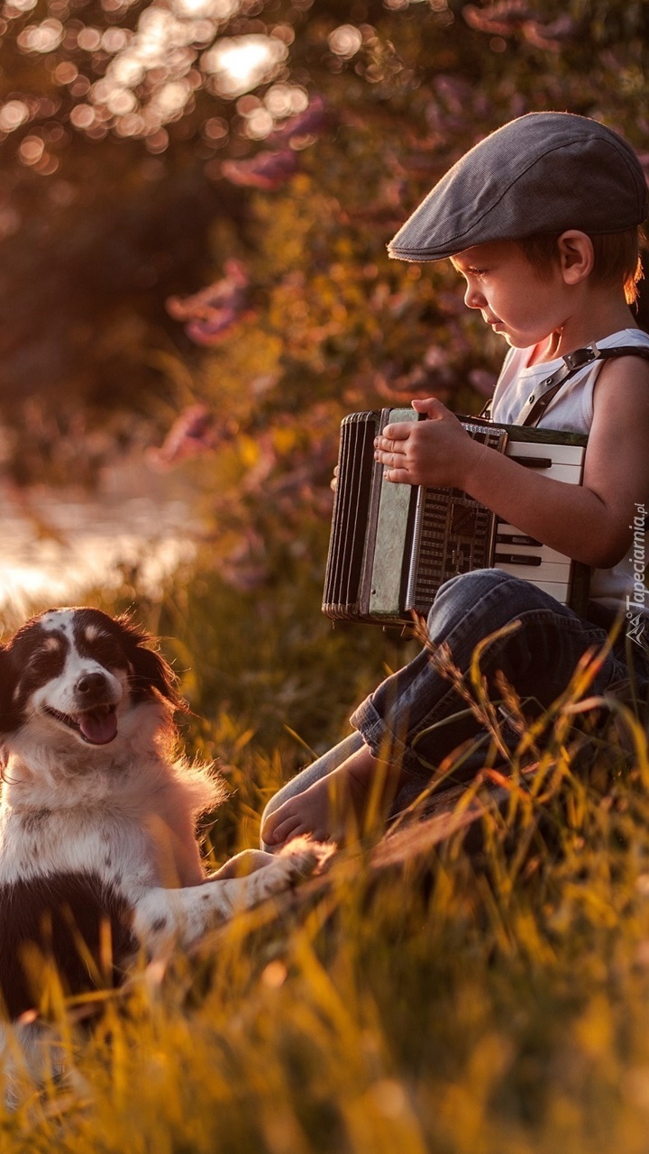 Edytor tapety: Chłopczyk grający psu na akordeonie