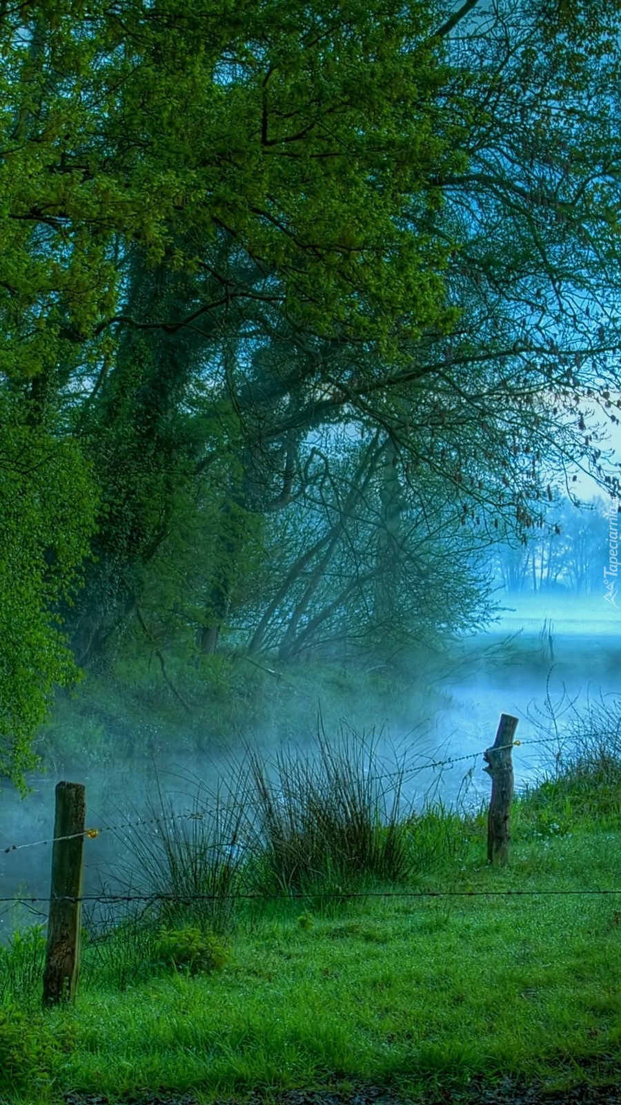Edytor tapety: Ogrodzona łąka we mgle