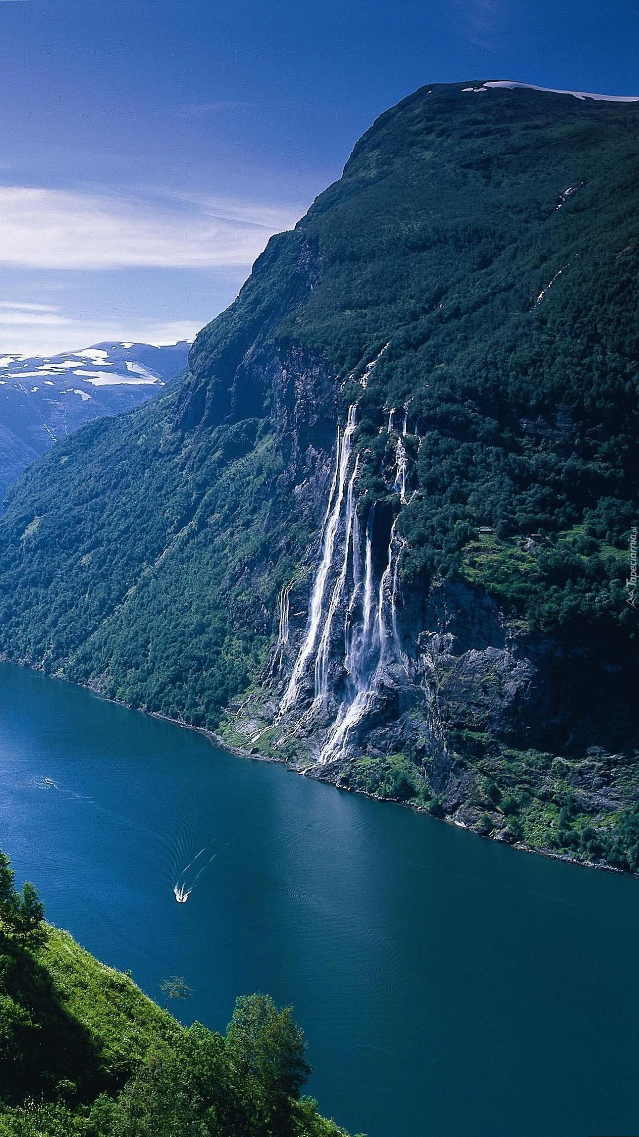 Edytor tapety: Statek w fiordzie pod wodospadem