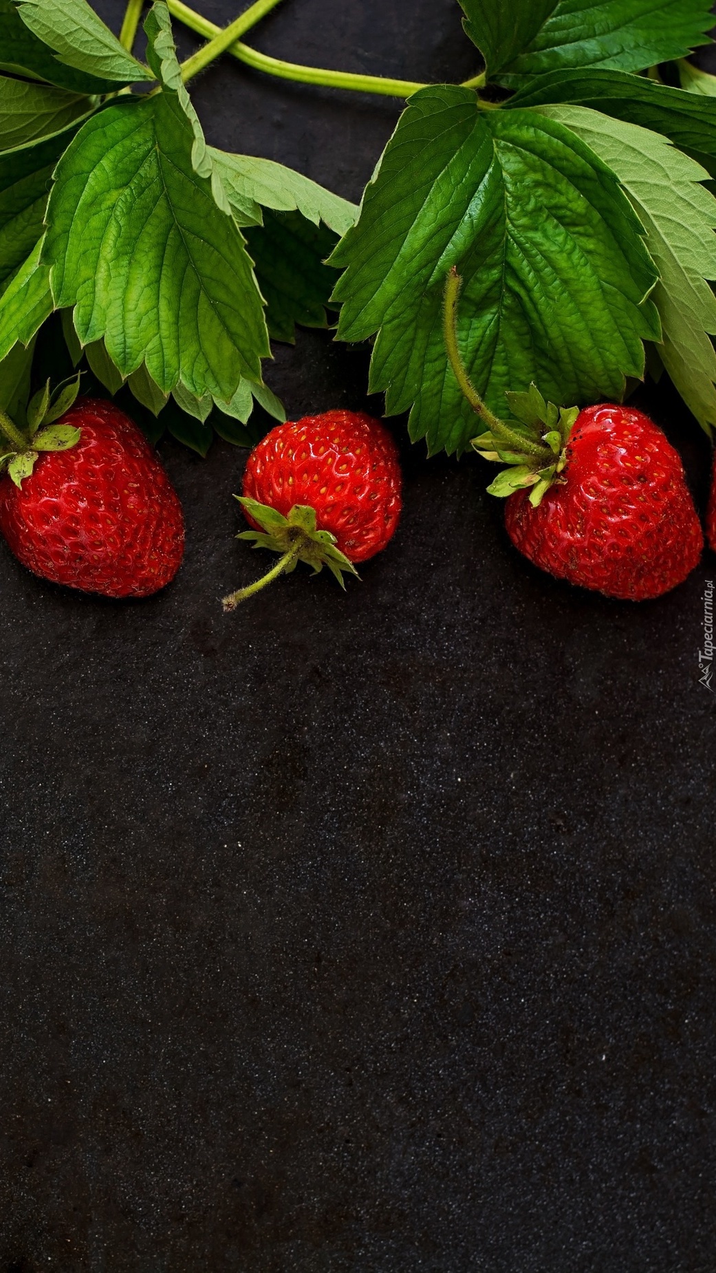 Edytor tapety: Truskawki z liśćmi na ciemnym tle