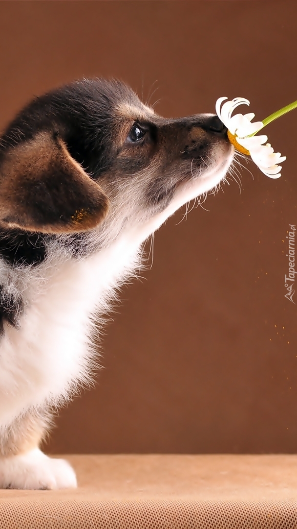 Edytor tapety: Szczeniak wąchający kwiatek