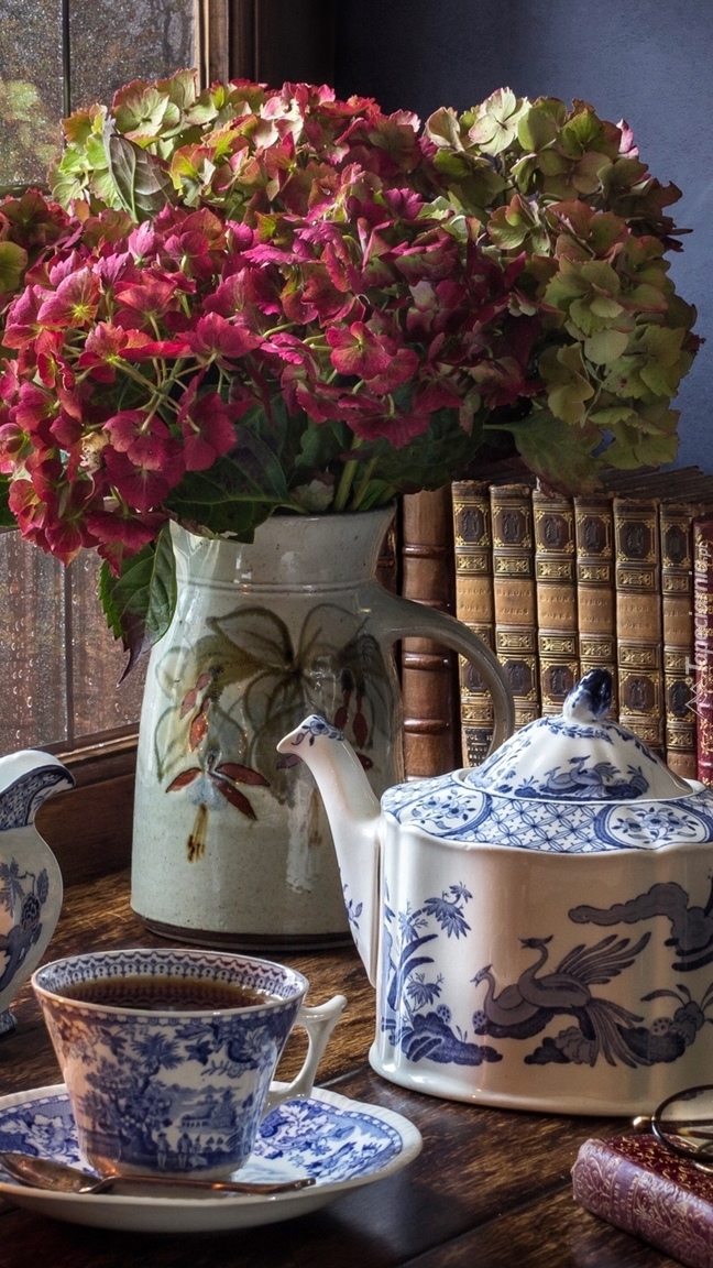 Edytor tapety: Herbata w filiżance i bukiet hortensji