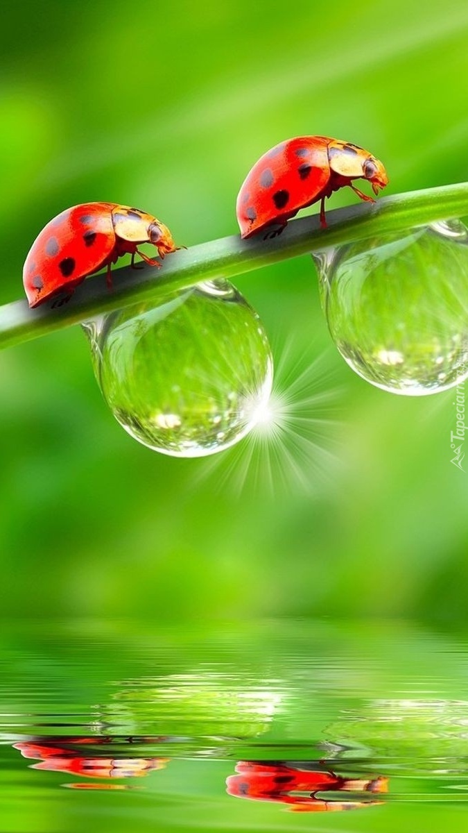 Edytor tapety: Biedronki na łodyżce w kroplach wody