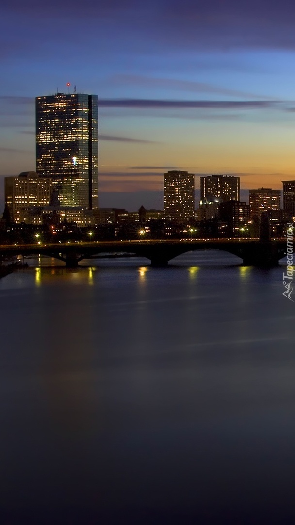 Edytor tapety: Miasto nad wodą o zachodzie słońca