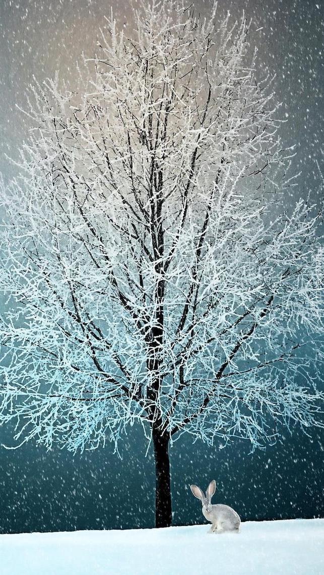 Edytor tapety: Zziębnięty zajączek pod oszronionym drzewem