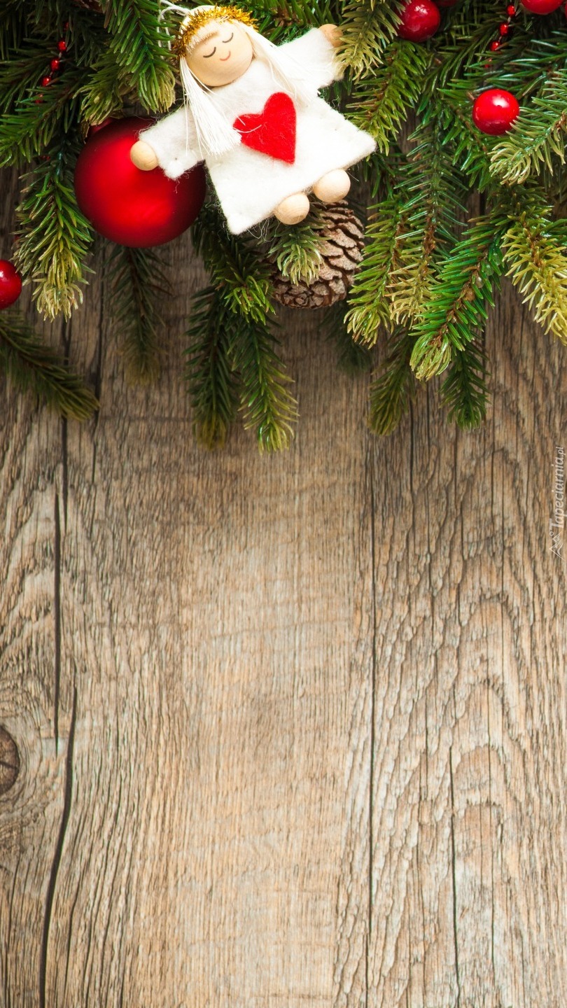 Edytor tapety: Figurka aniołka na świerkowych gałązkach