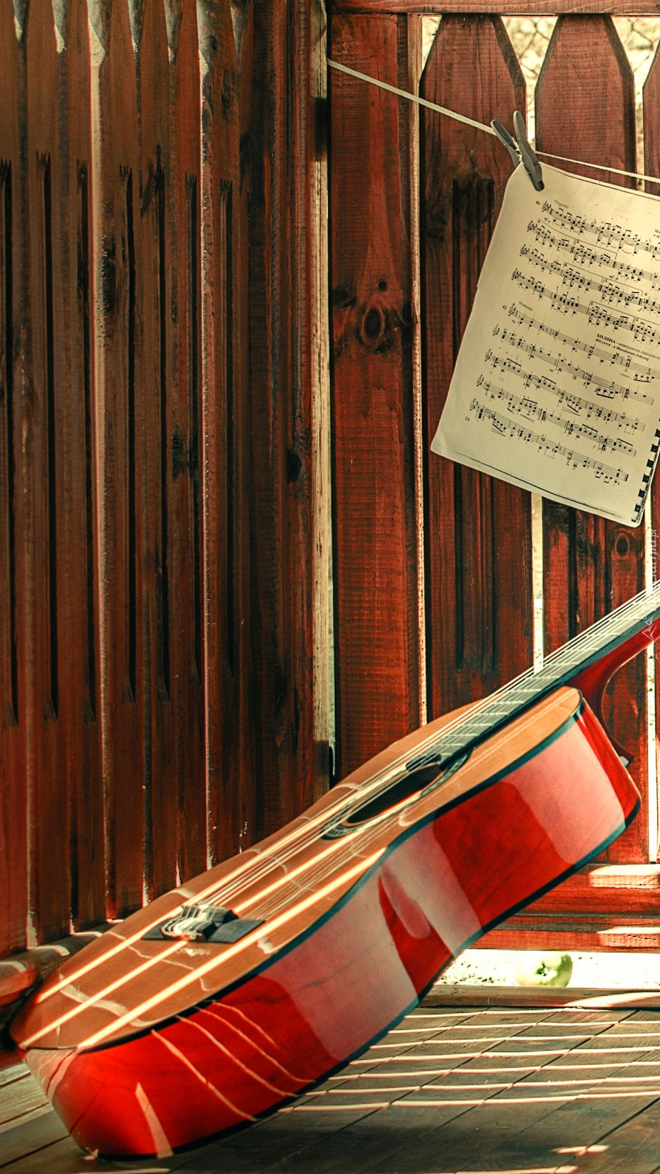 Edytor tapety: Gitara i nuty na płocie