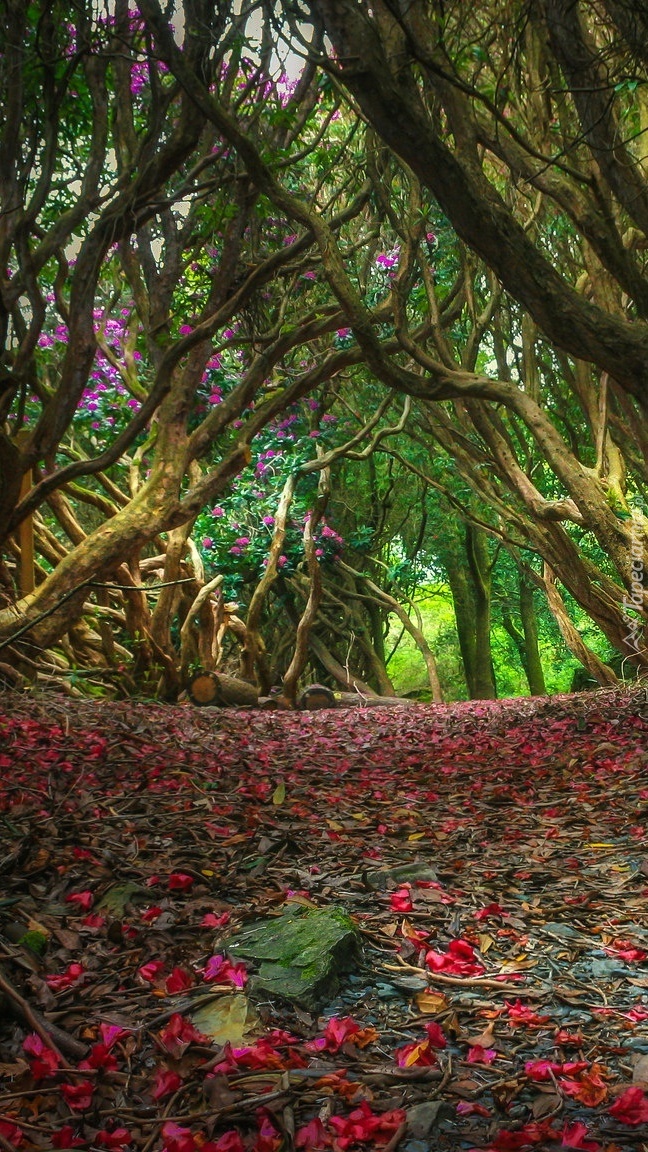 Edytor tapety: Płatki kwiatów na leśnej drodze