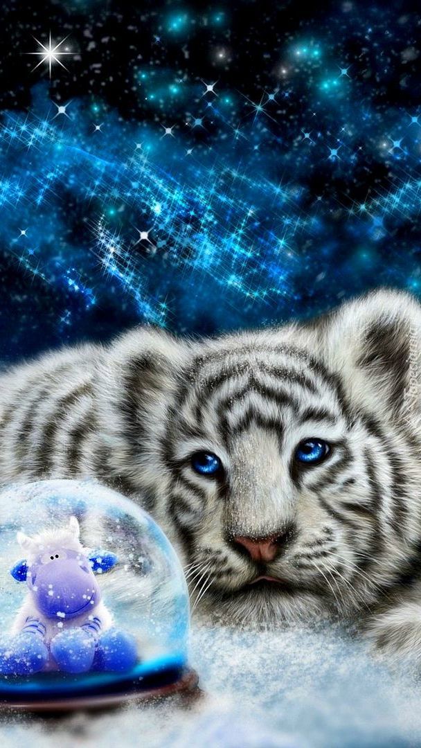 Edytor tapety: Biały tygrysek obok szklanej kuli