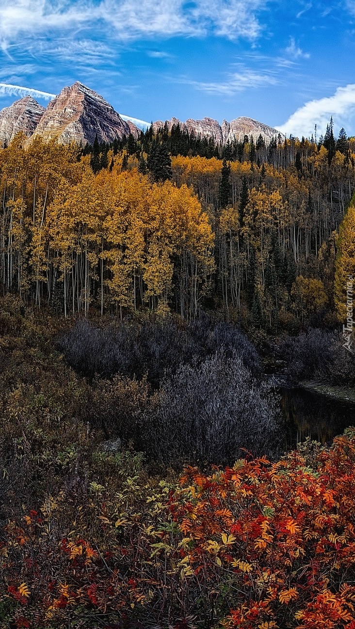 Edytor tapety: Wierzchołki gór za jesiennym lasem