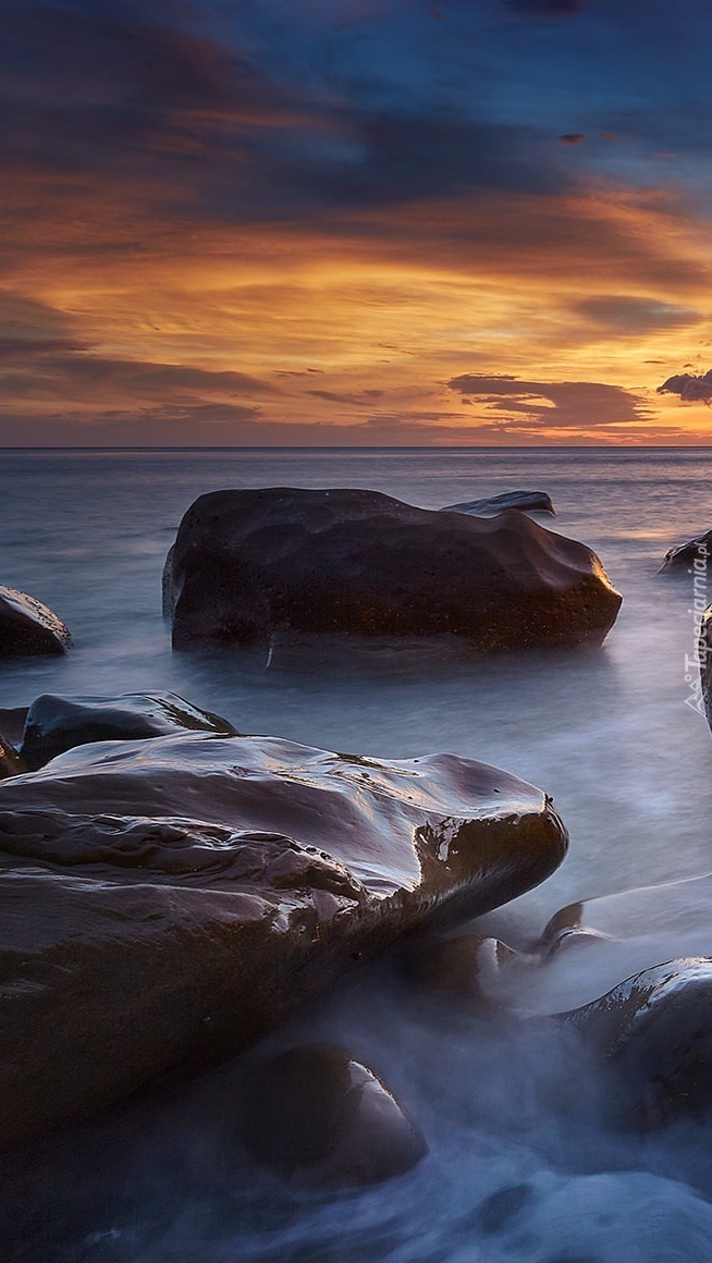 Edytor tapety: Zachód słońca nad kamienistym brzegiem morza