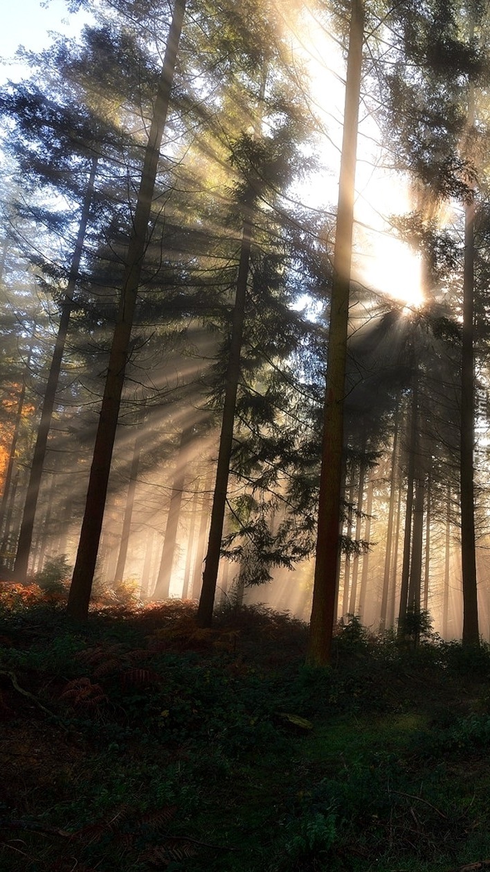 Edytor tapety: Promienie słońca między drzewami
