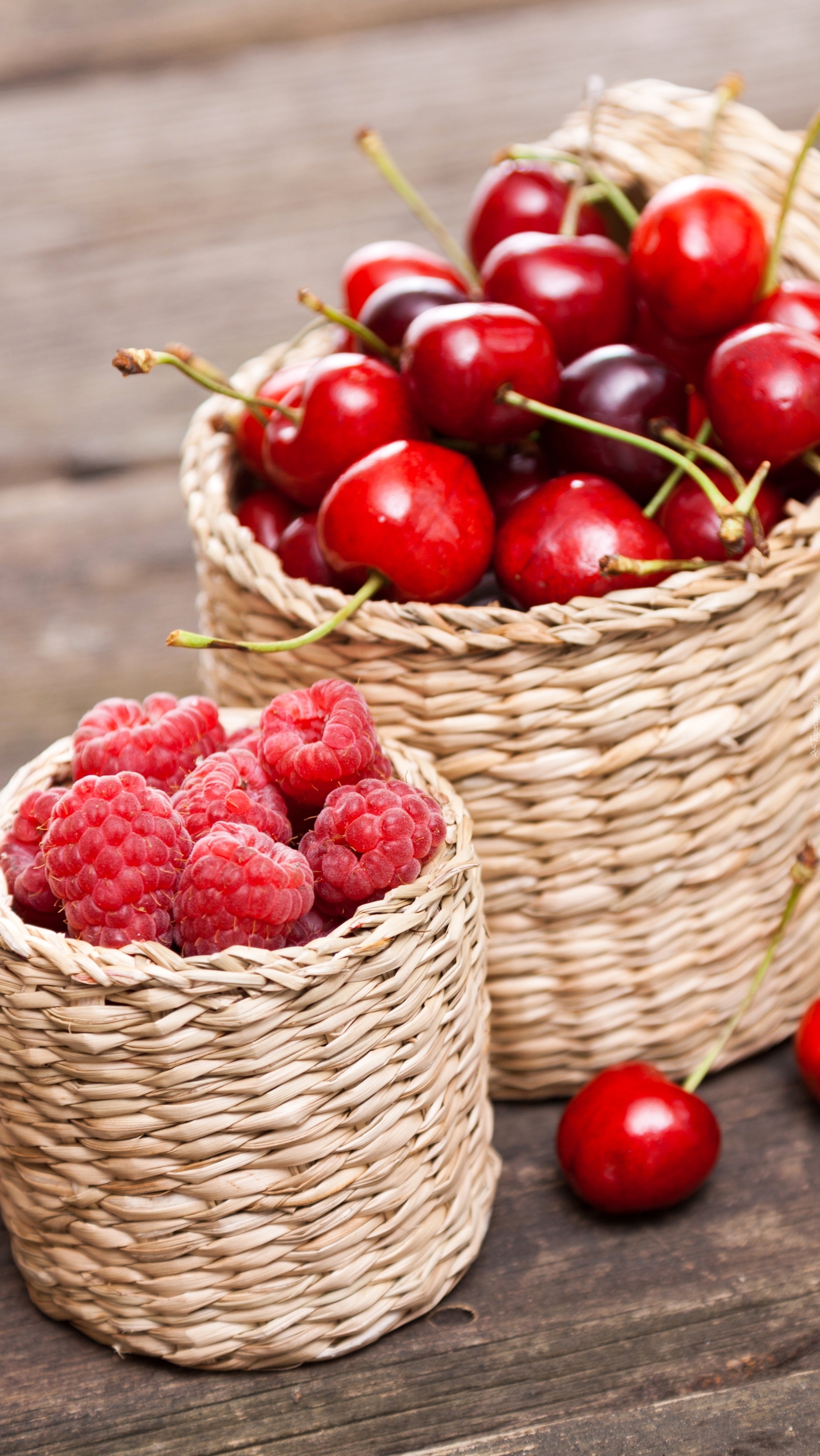 Edytor tapety: Maliny i czereśnie w koszyczkach