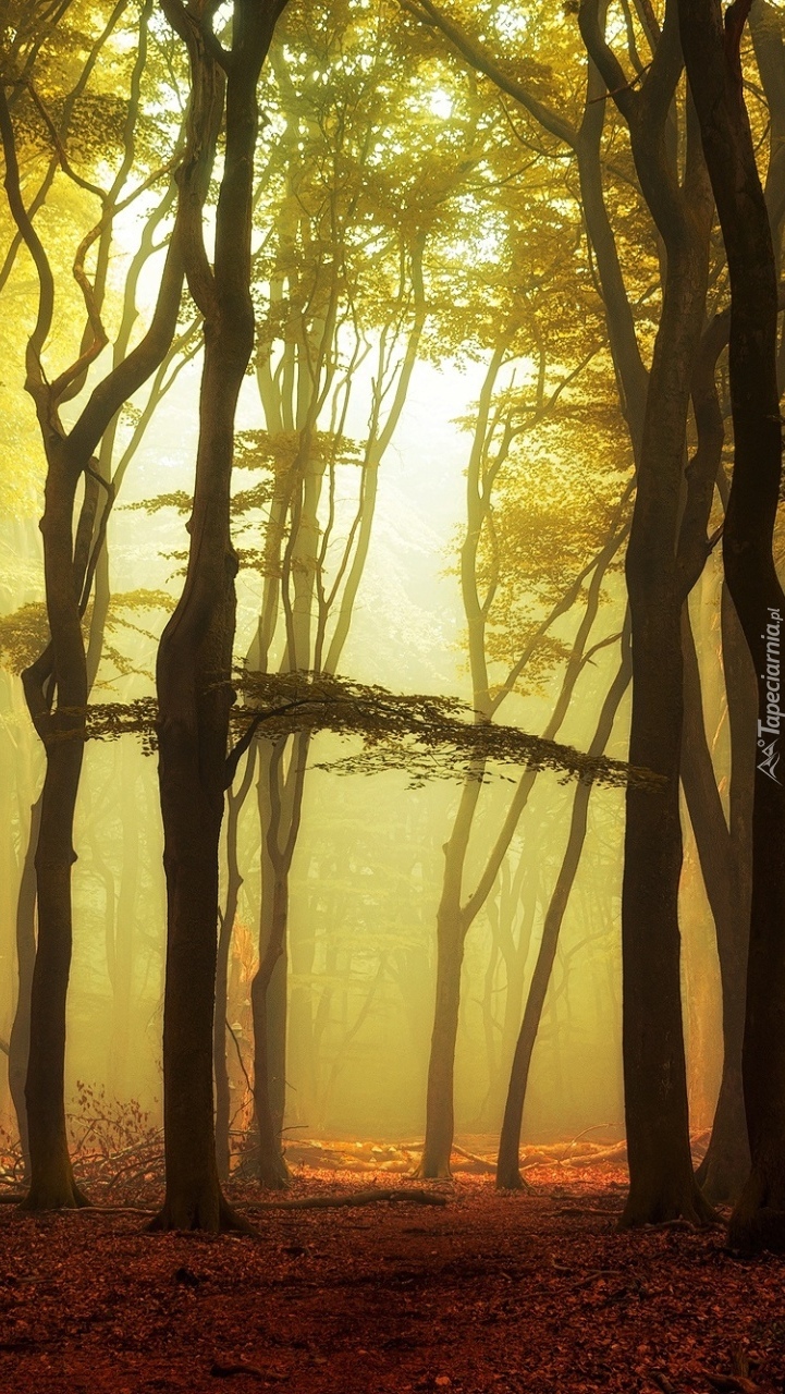 Edytor tapety: Wysokie drzewa w lesie osnutym mgłą