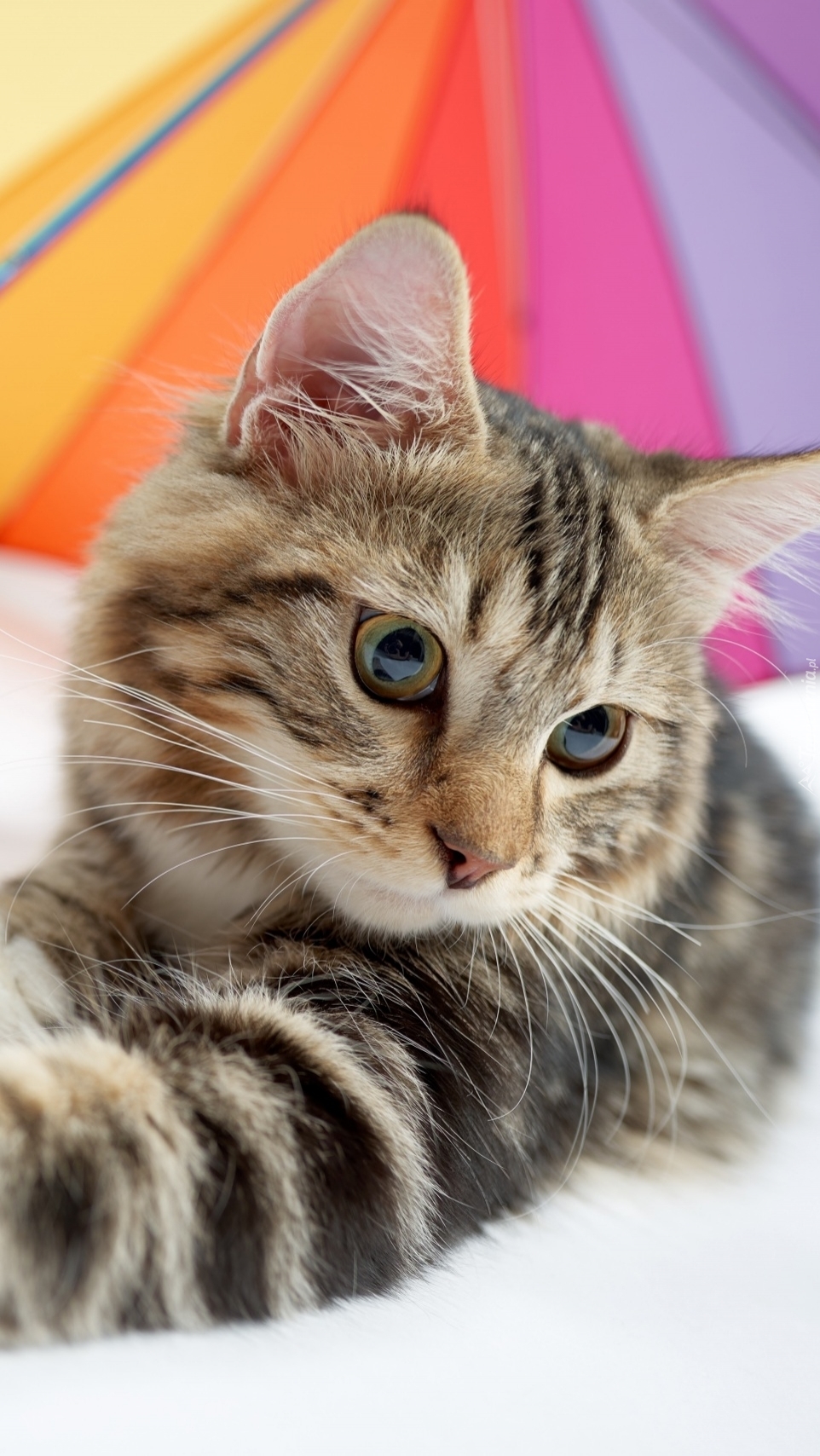 Edytor tapety: Kotek pod kolorową parasolką