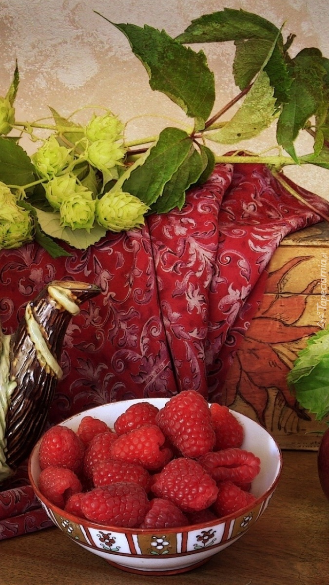 Edytor tapety: Maliny w miseczce i chmiel