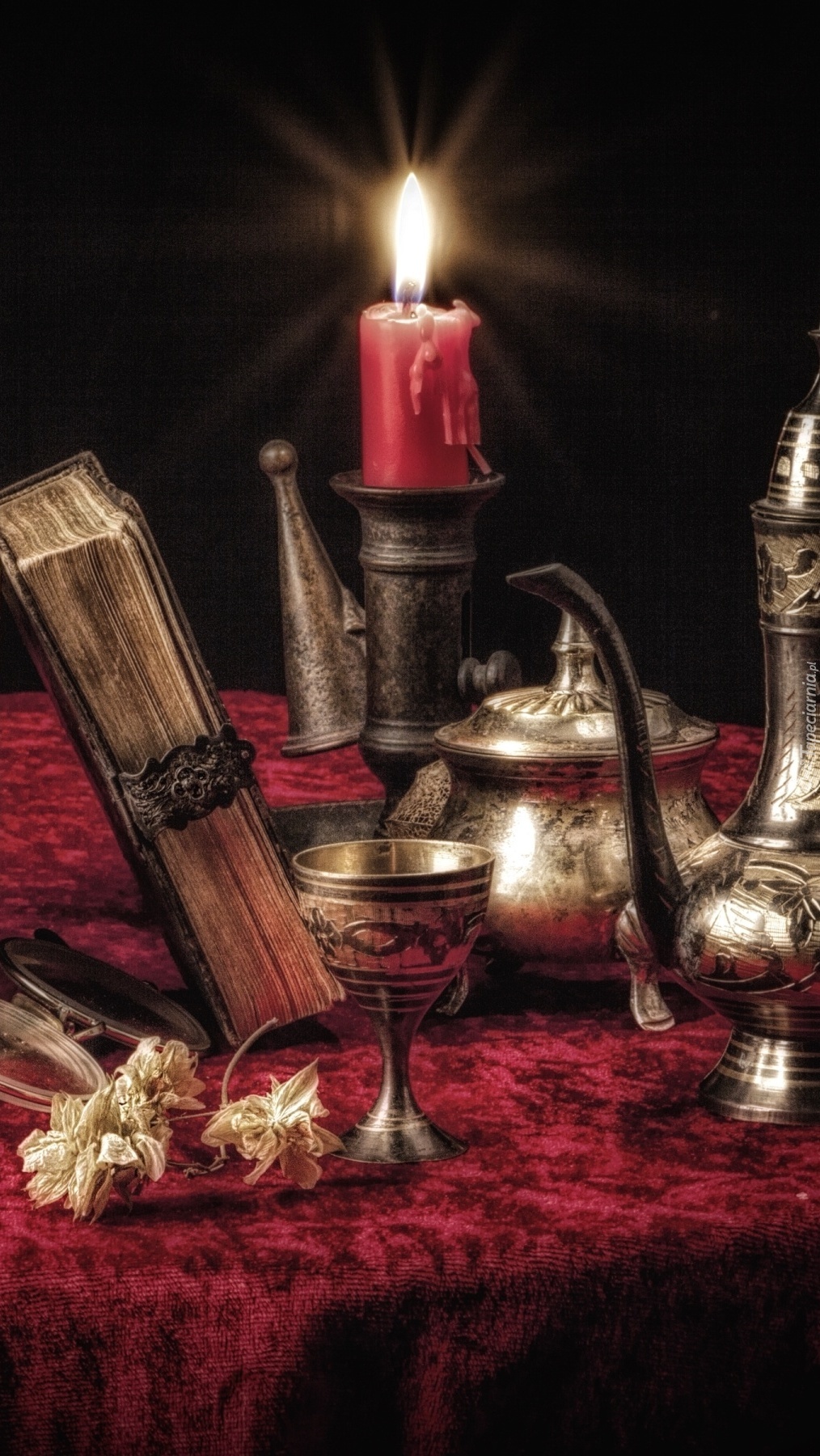 Edytor tapety: Świeczka pośród cynowych naczyń
