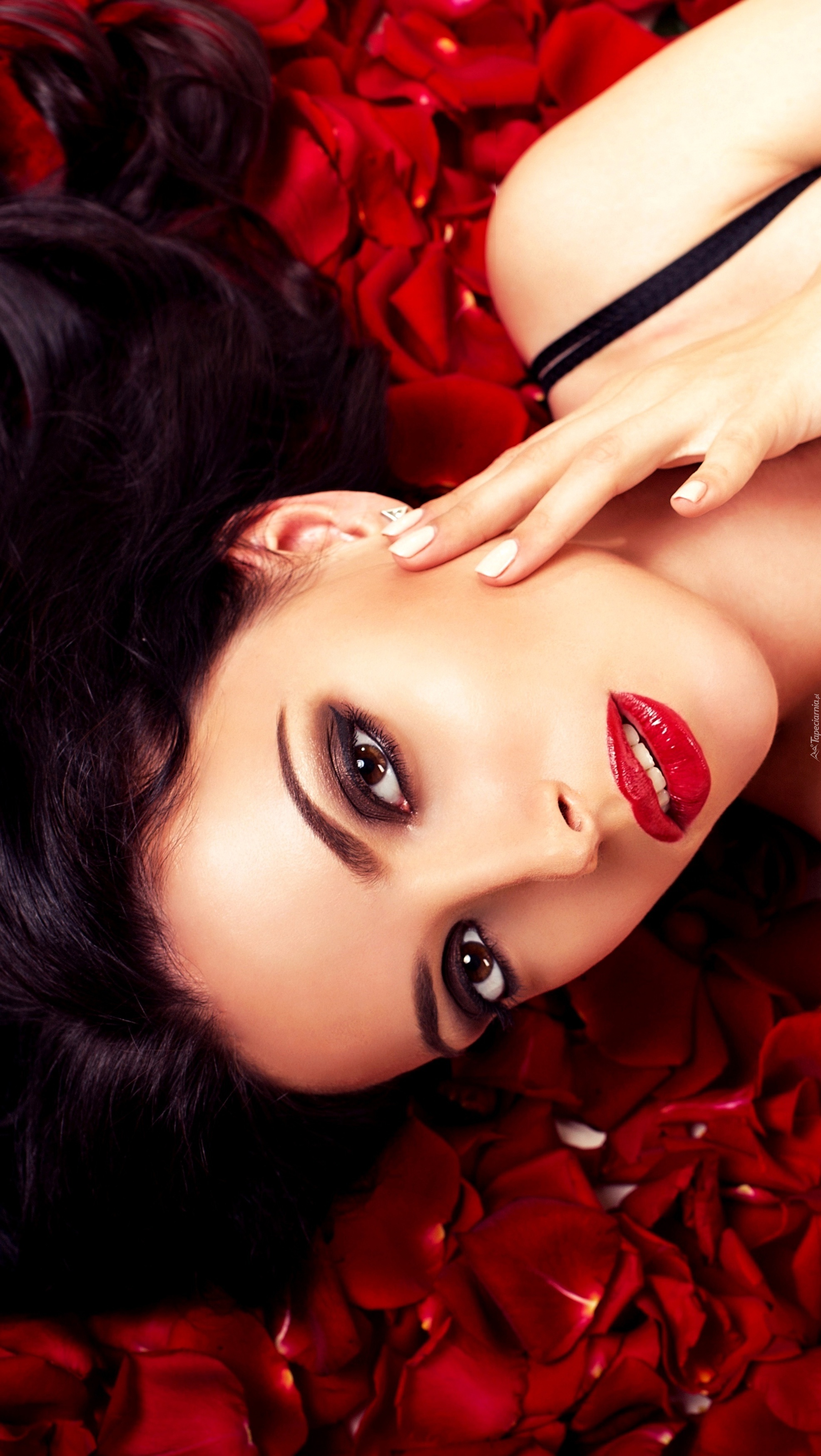 Edytor tapety: Kobieta leżąca na płatkach róż