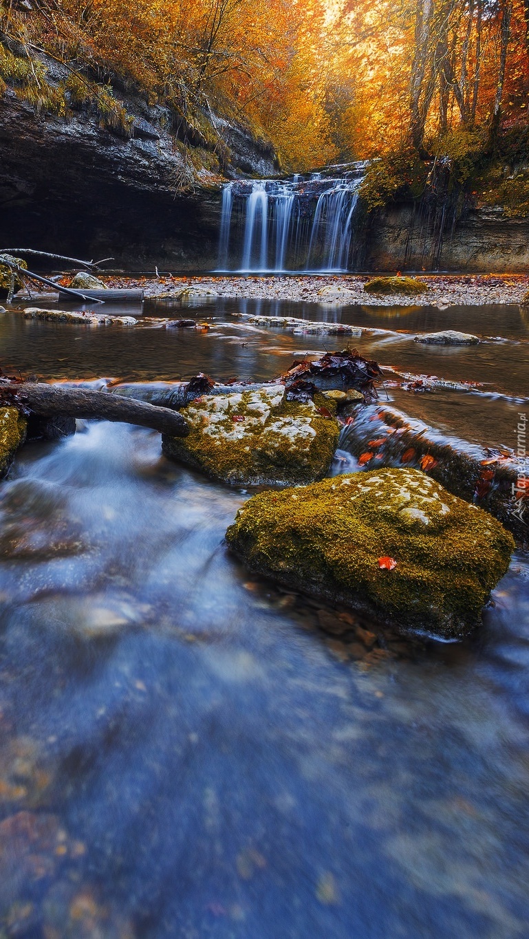 Edytor tapety: Jesienna leśna rzeka z omszałymi kamieniami