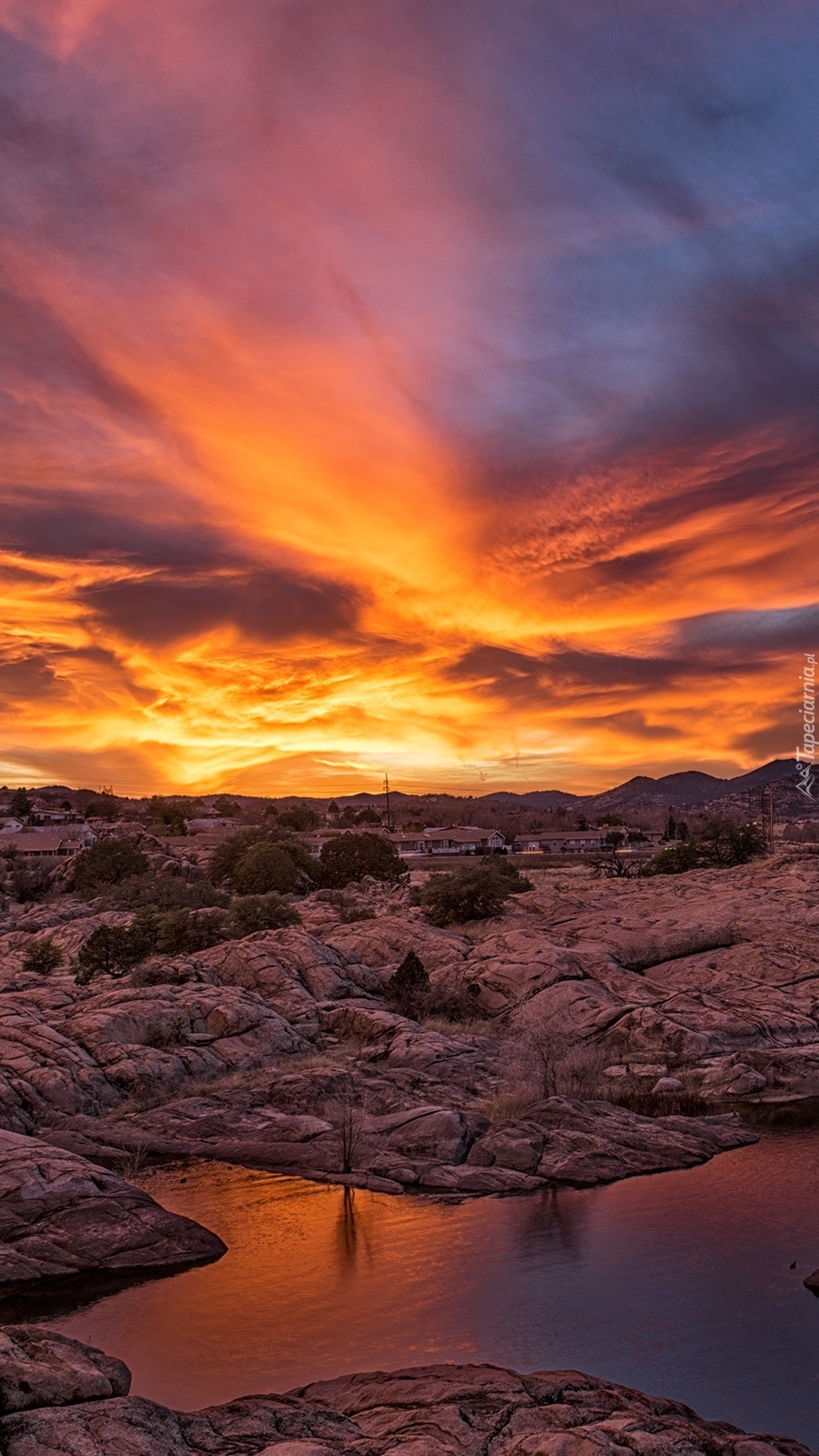 Edytor tapety: Domy wśród skał o zachodzie słońca