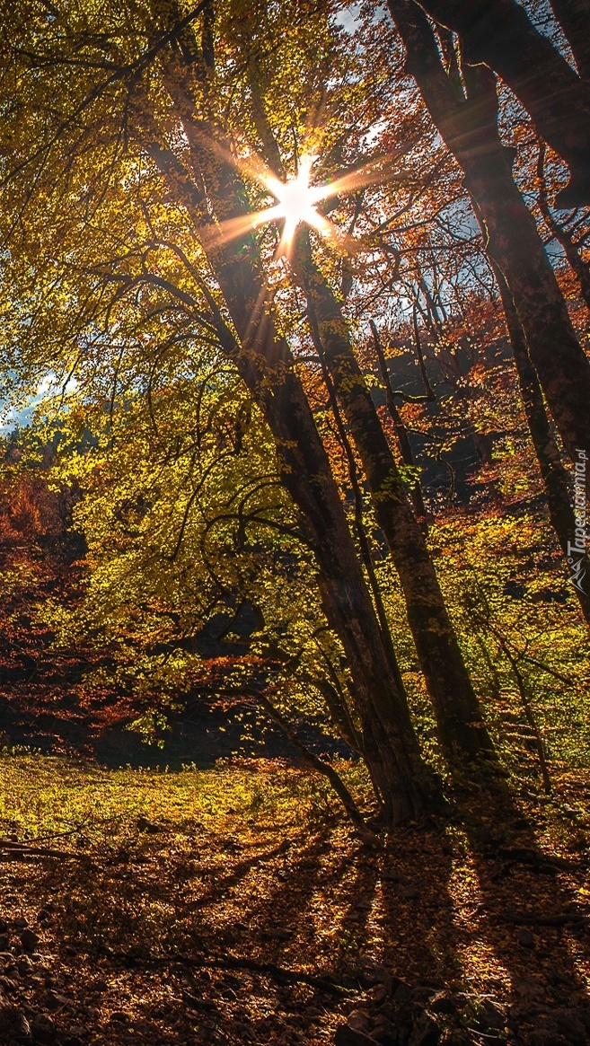 Edytor tapety: Las w promieniach słońca jesienią