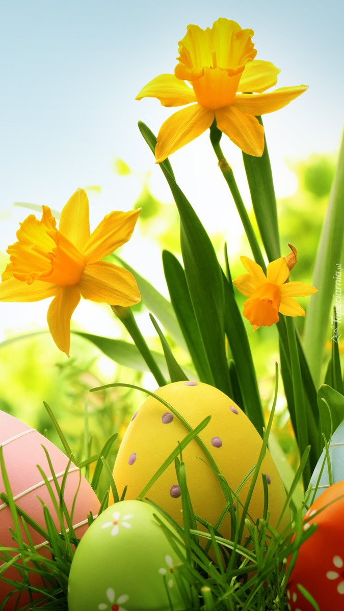 Edytor tapety: Pisanki obok kwitnących żonkili