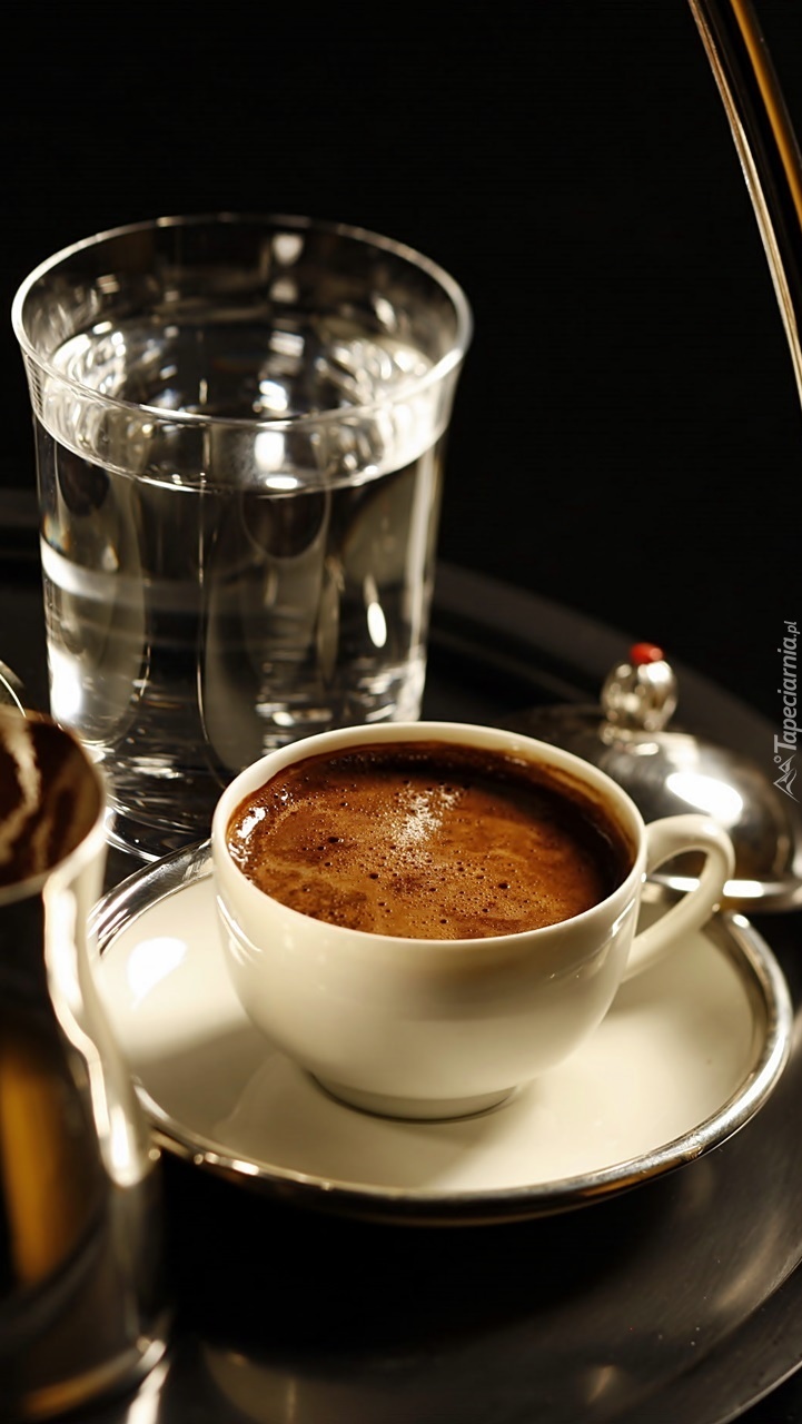 Edytor tapety: Szklanka wody obok filiżanki z kawą