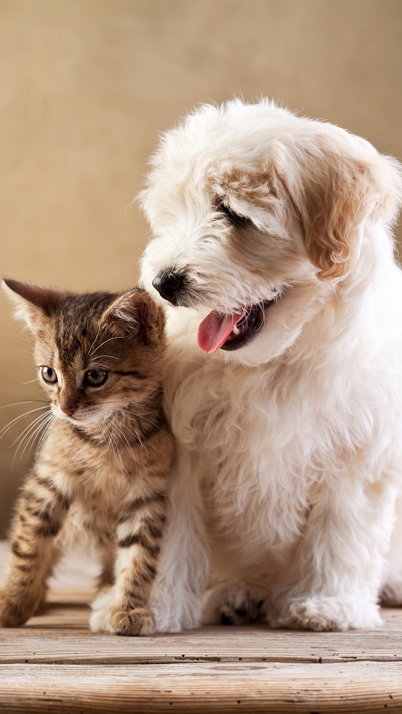 Edytor tapety: Piesek z kotkiem w zgodzie żyją