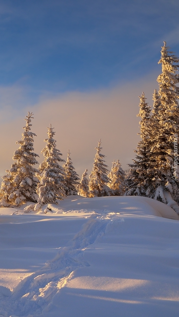 Edytor tapety: Ośnieżone świerki o wschodzie słońca