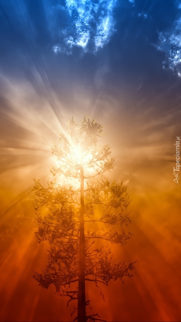 Edytor tapety: Drzewo w promieniach słońca we mgle