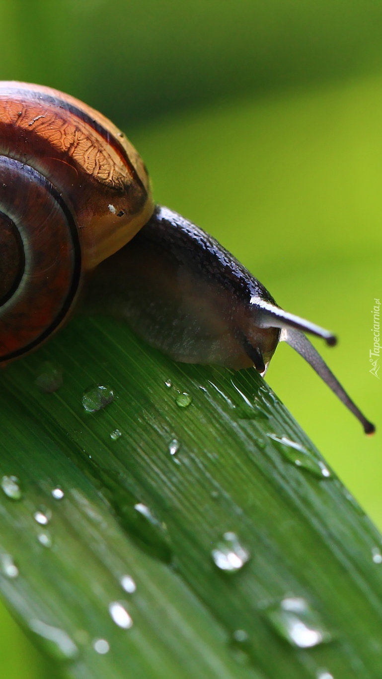 Edytor tapety: Ślimak na liściu w kroplach
