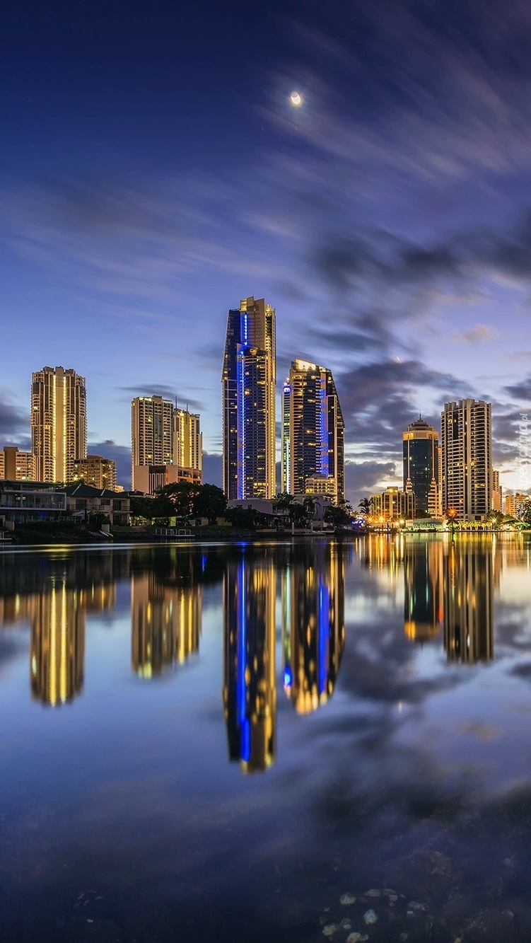 Edytor tapety: Drapacze chmur nad rzeką nocą
