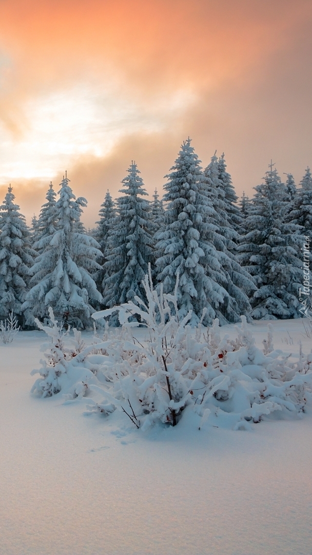 Edytor tapety: Zachód słońca nad ośnieżonym lasem