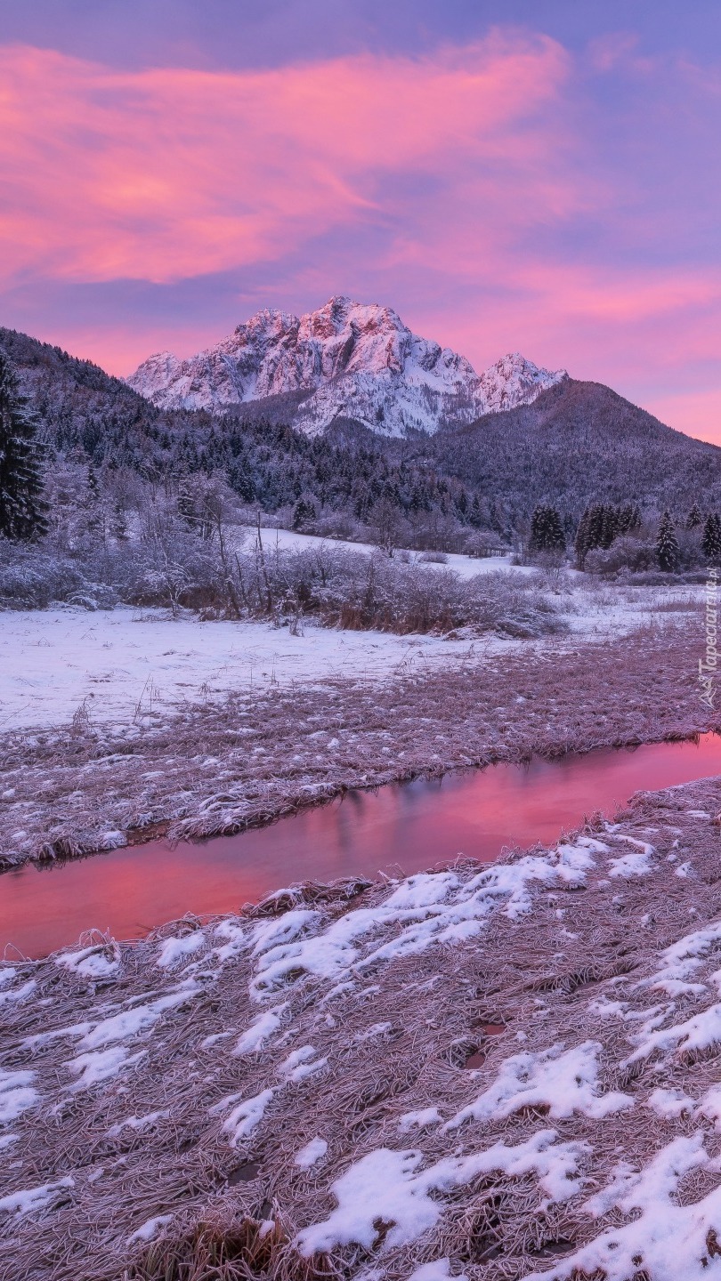 Edytor tapety: Różowe niebo nad ośnieżonymi górami