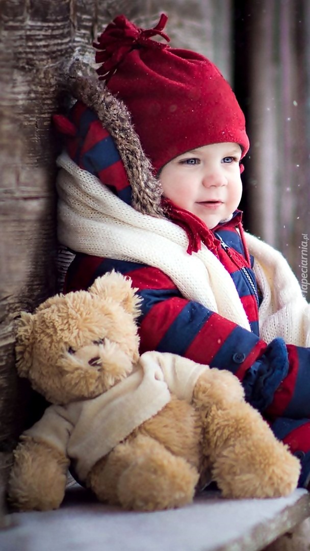 Edytor tapety: Dziecko i pluszowy miś na ławce