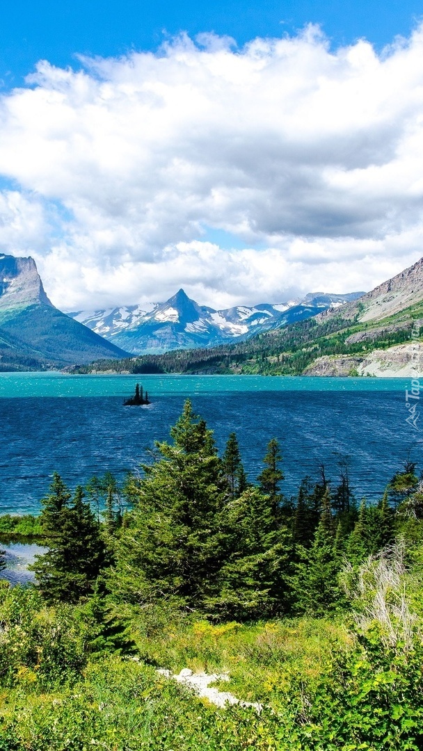 Edytor tapety: Gęste chmury nad górami i jeziorem