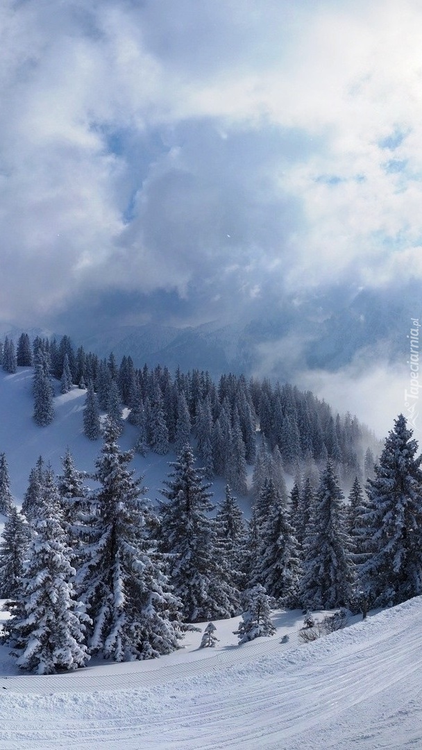 Edytor tapety: Górska dolina z ośnieżonymi świerkami