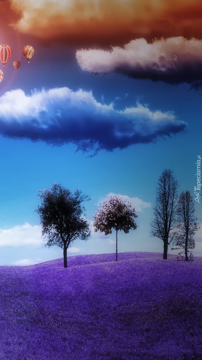 Edytor tapety: Balony w chmurach nad fioletową łąką