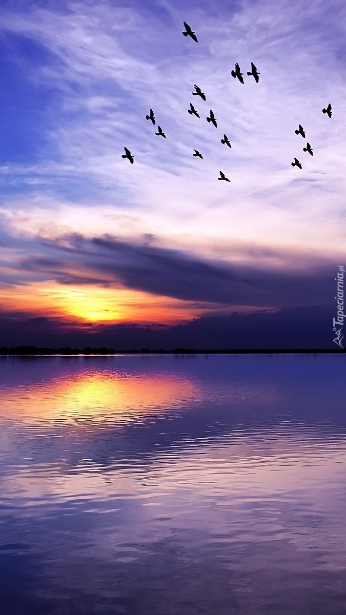 Edytor tapety: Ptaki nad wodą o zachodzie słońca