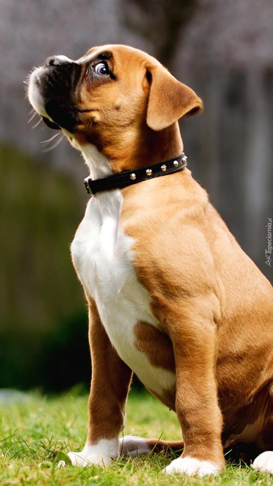 Edytor tapety: Bokser w obroży na trawie