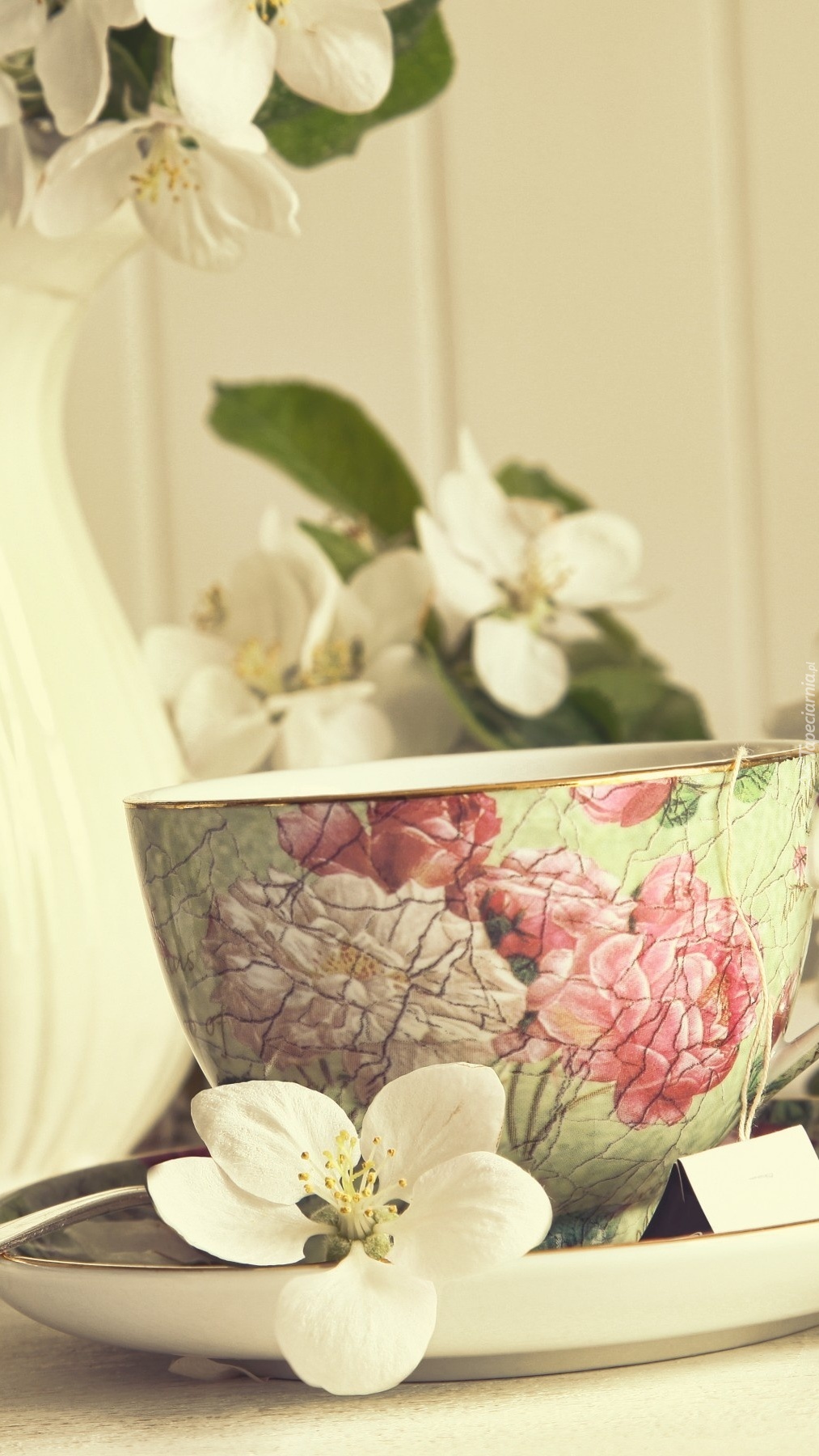 Edytor tapety: Kwiaty jaśminu przy filiżance herbaty