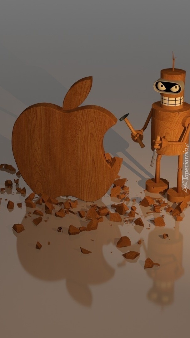 Edytor tapety: Ludzik z młotkiem przy drewnianym jabłku